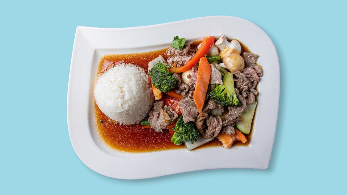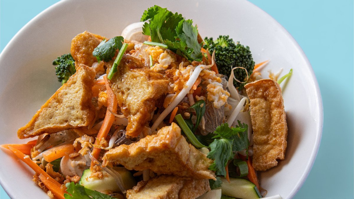 gebratene Reis-Bandnudeln mit Erdnüssen, asiatischem Gemüse und einer Zutat deiner Wahl