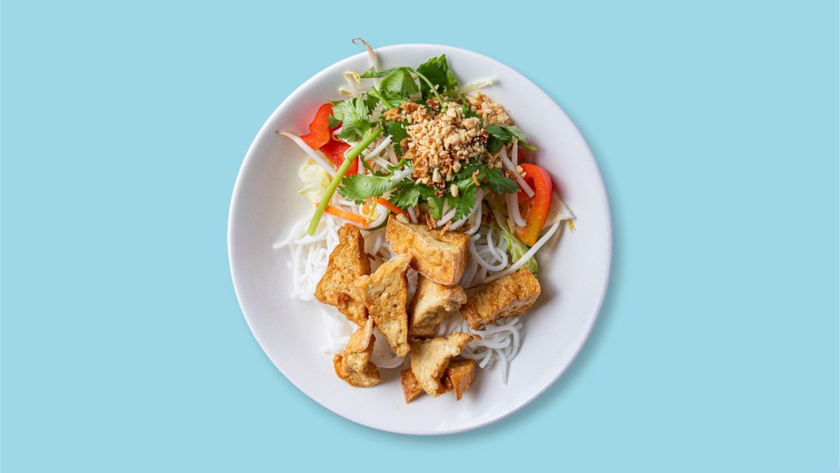 pikant Reisnudeln mit Lemongrass, Erdnüssen, frischem vietnamesischem Salat, gerösteten Zwiebeln serviert mit Nuoc-Mam-Soße und einer Zutat deiner Wahl