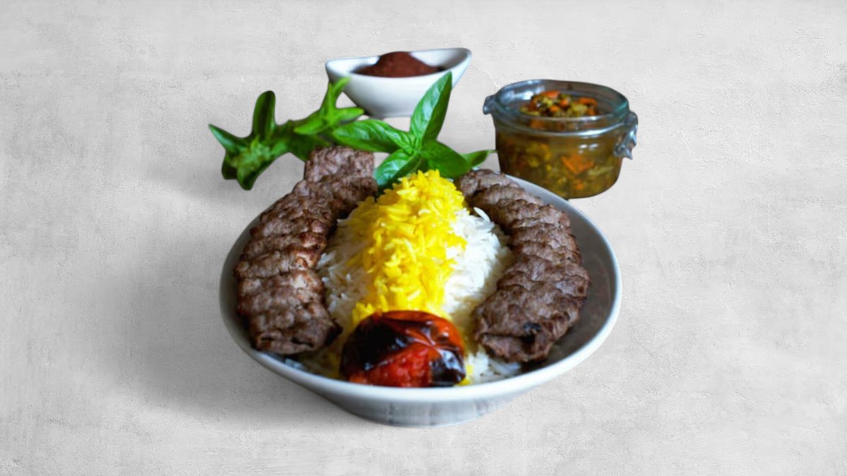 Erleben Sie den legendären Kubideh - 2 Hackfleischspieße (Halal), serviert mit Safran-Butter-Basmati-Reis, gegrillten Tomaten, Gemüse und Fladenbrot. Persischer Kebab-Genuss!