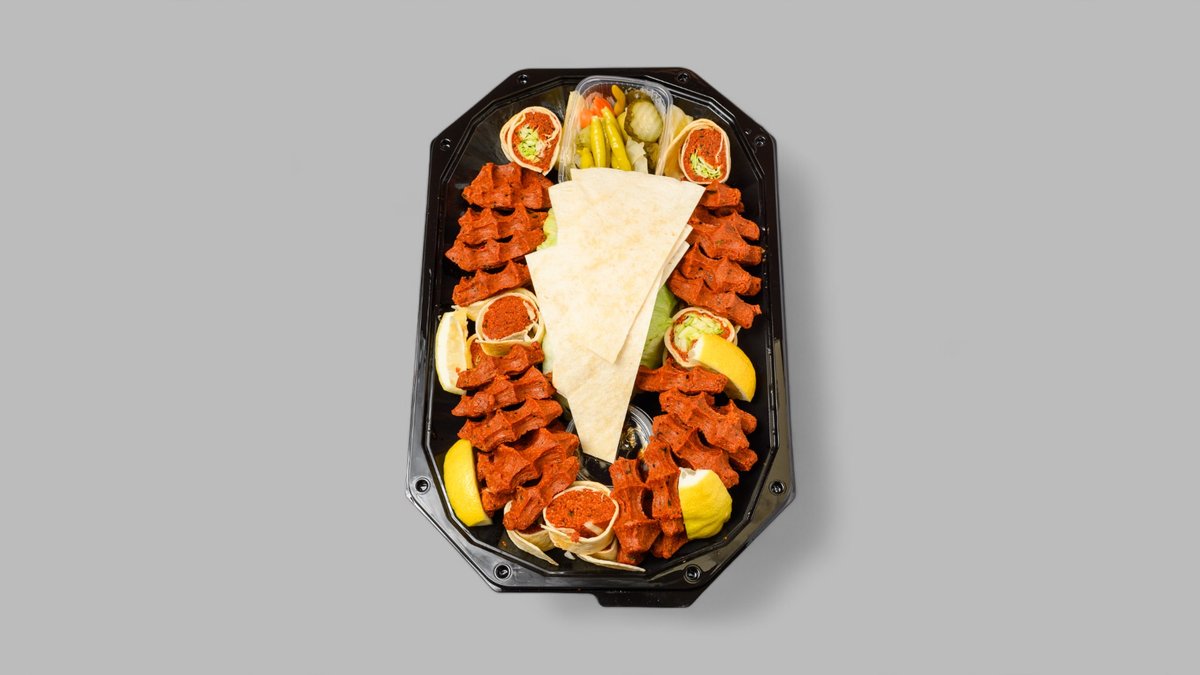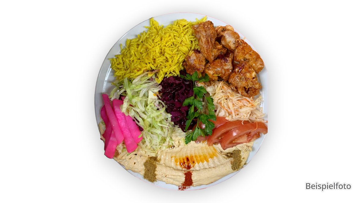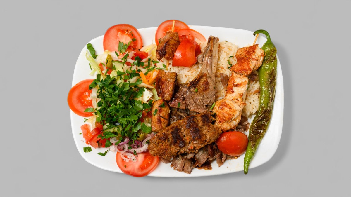 mit Lammkoteletts, Köfte-Spieß, Hähnchenspieẞ, Kalbspieẞ, Dönerfleisch, Salat, Beilage deiner Wahl und in einer Größe deiner Wahl