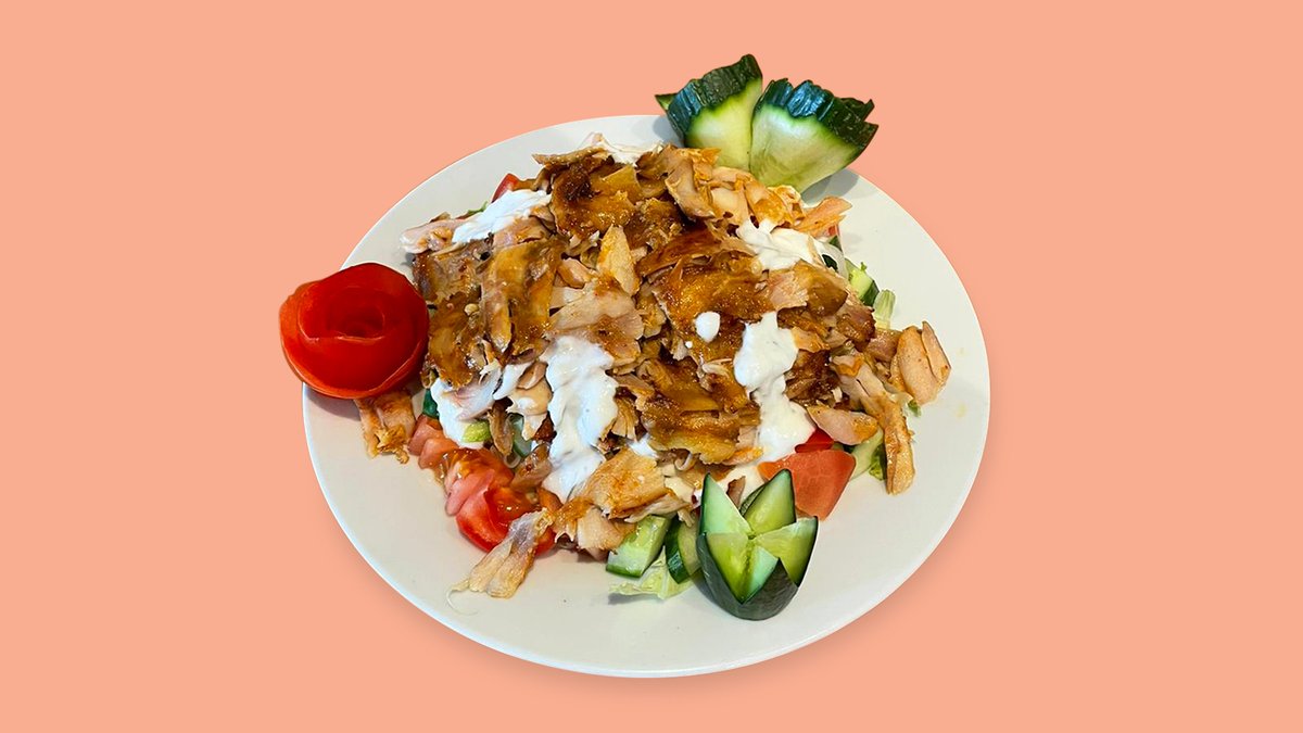 mit Hähnchenbruststreifen, Eisbergsalat, Tomaten, Gurken, Krautsalat, Zwiebeln und Soße