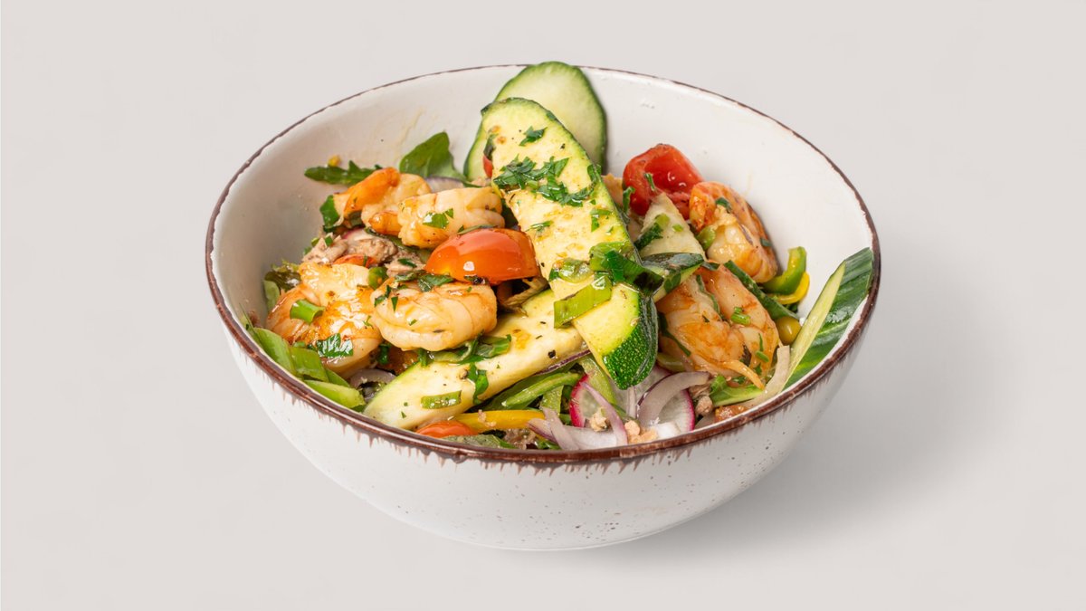 Insalata Mista mit gebratenen Garnelen, Zucchini, Lauchzwiebeln und Kirschtomaten