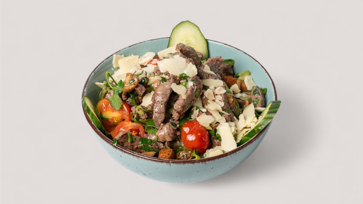 Insalata Mista mit gebratenen Rinderstreifen, Champignons, Lauchzwiebeln und gehobeltem Parmesan