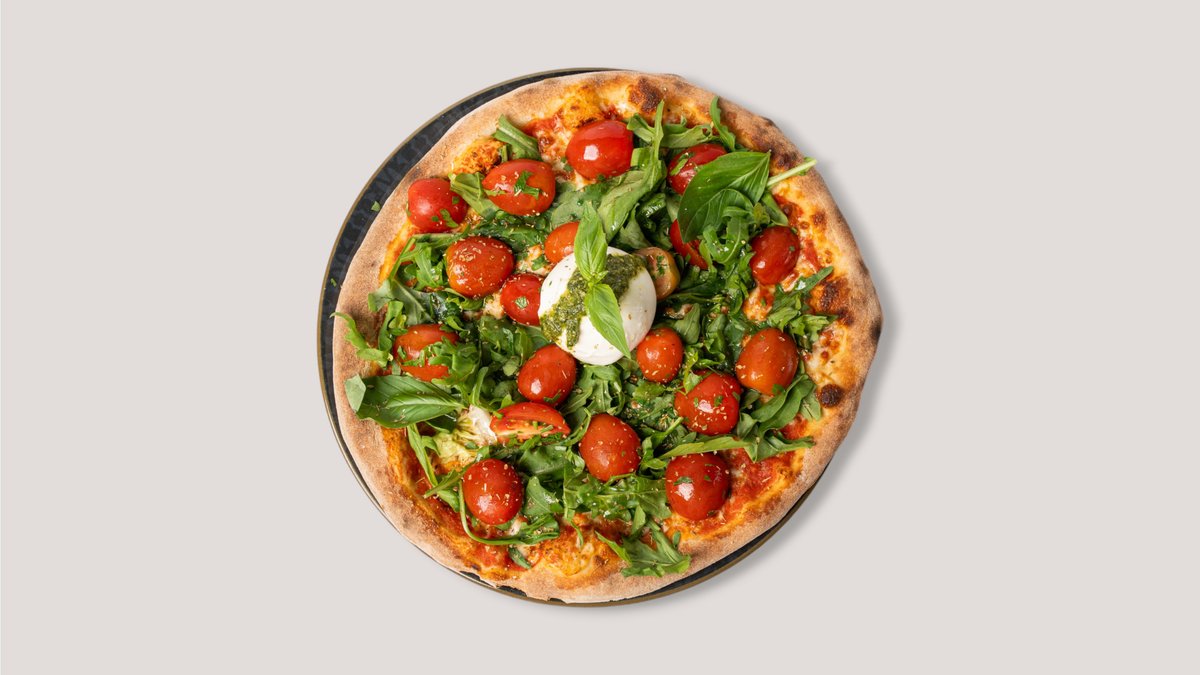 mit marinierten Kirschtomaten, Burrata-Käse, Basilikum-Pesto und Rucola