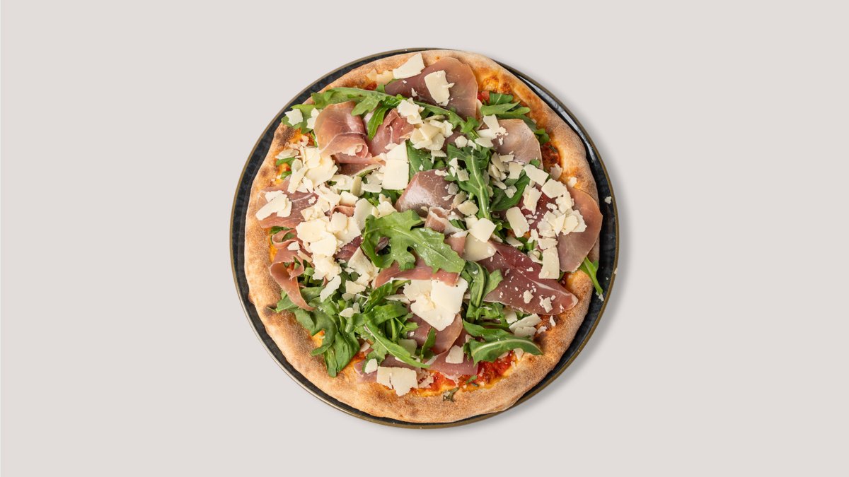 mit luftgetrocknetem italienischem Landschinken, Rucola und gehobeltem Parmesan