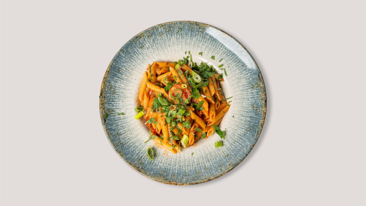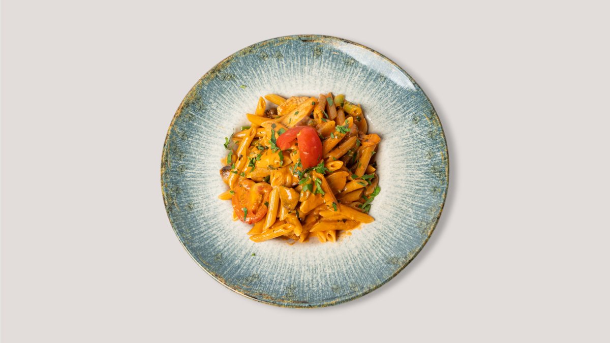 mit gebratenen Hähnchenbruststreifen, Champignons, Kirschtomaten und Lauchzwiebeln in Tomaten-Sahne-Creme