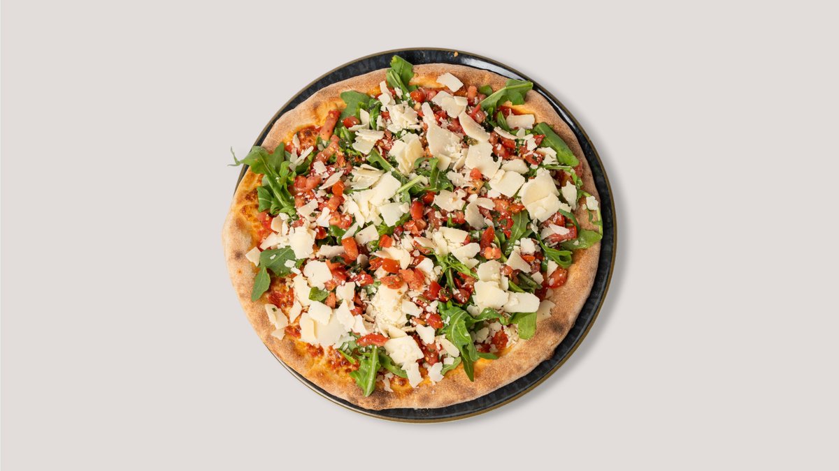 mit marinierten Tomatenwürfeln, Rucola und italienischem Hartkäse