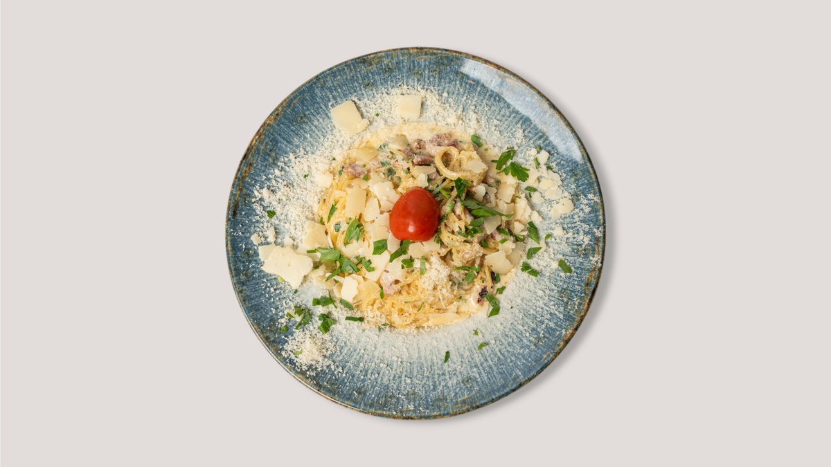 Spaghettini mit gebratenem Speck, italienischem Hartkäse und Eigelb