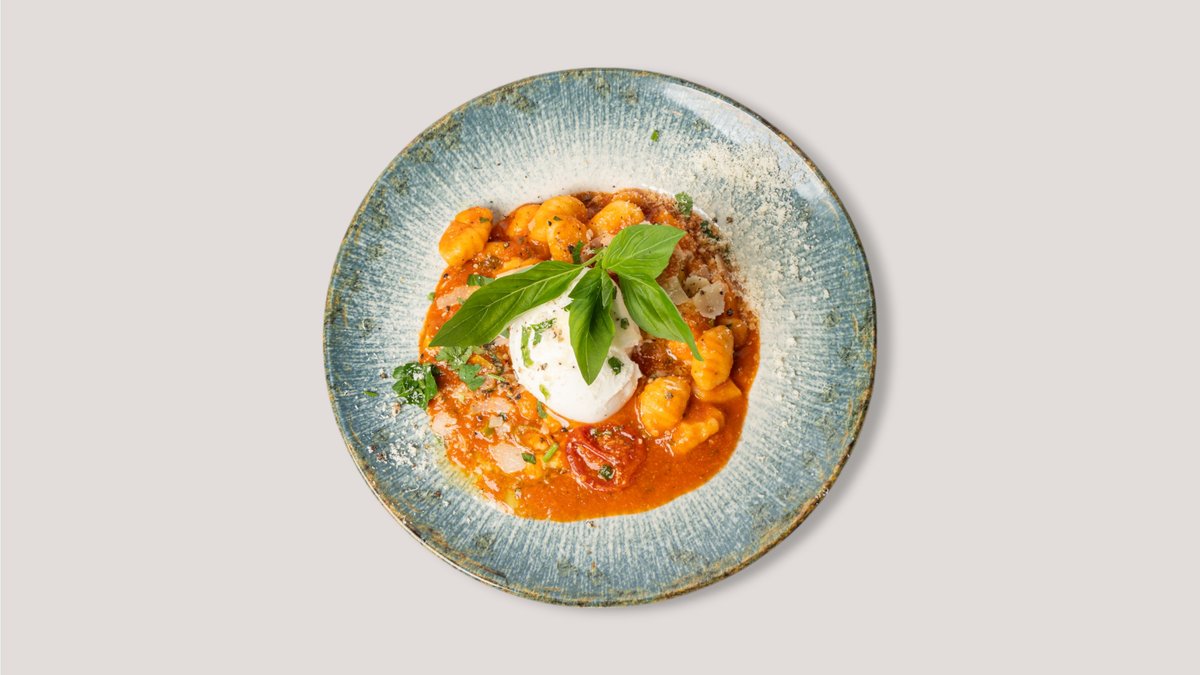 mit Burrata und frischem Basilikum in Tomaten-Mozzarella-Creme