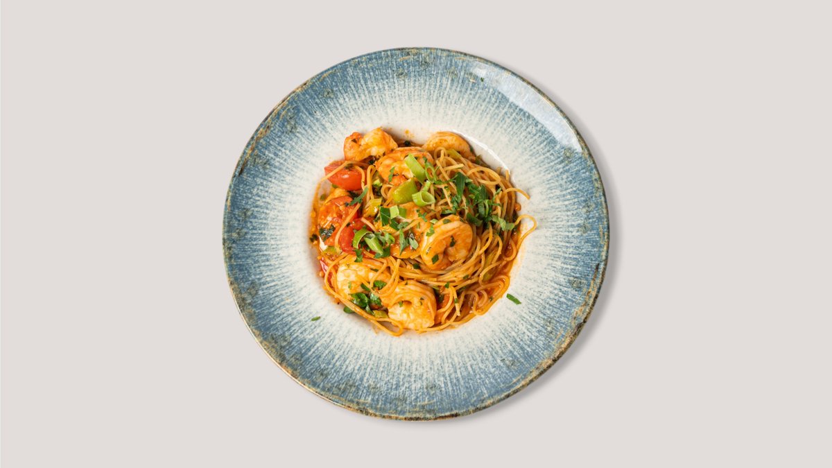 Spaghettini mit gebratenen Garnelen, Kirschtomaten und Lauchzwiebeln in pikanter Tomaten-Weißweinsoße Enthält Alkohol, für Kinder und schwangere Frauen nicht geeignet
