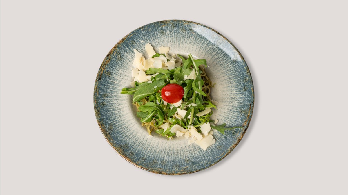 Spaghettini mit frischem Basilikum-Pesto, Rucola und Parmesan