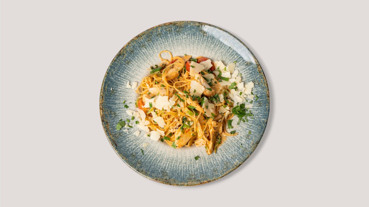Spaghettini mit Hähnchenbruststreifen, Lauchzwiebeln und Kirschtomaten in hausgemachter Chili-Käsesoße