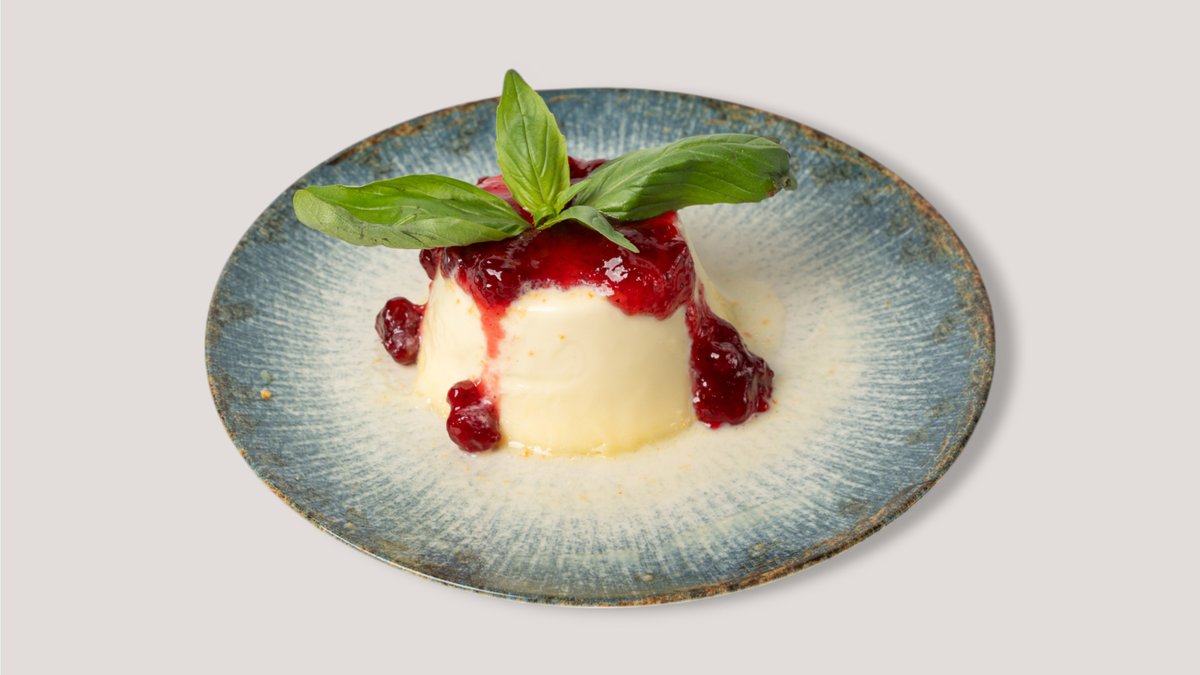 klassischer italienischer Nachtisch aus zart gesüßter Sahne, sanft mit Vanille aromatisiert und auf den Punkt gekühlt, serviert mit einer fruchtig-süßen Beerensoße