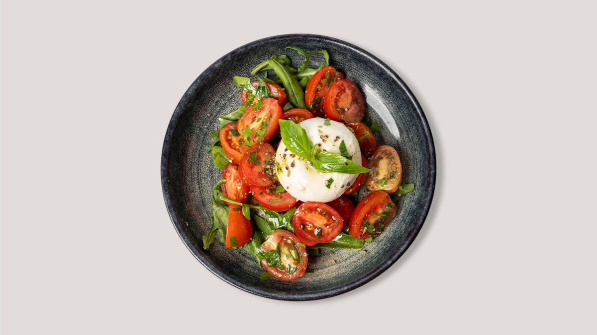 mit marinierten Kirschtomaten, Rucola und Burrata-Kugel