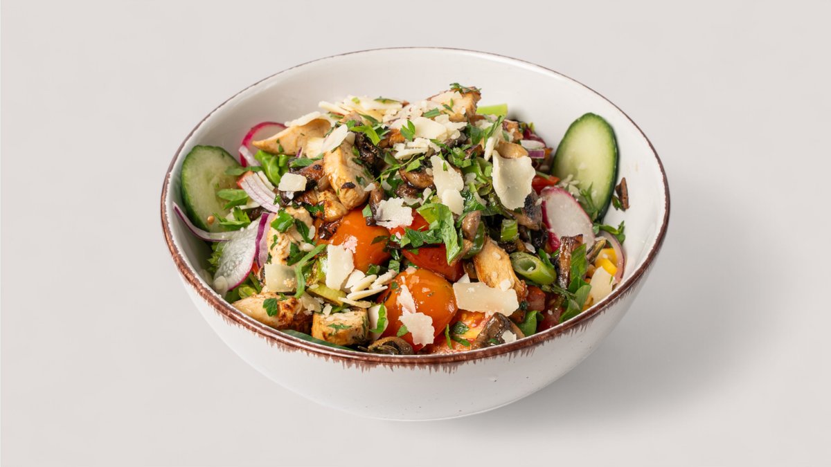Insalata Mista mit Hähnchenstreifen, Kirschtomaten, gehobeltem Parmesan, Lauchzwiebeln und Champignons