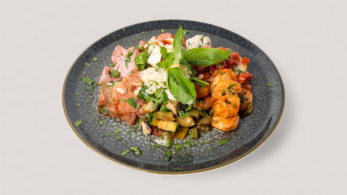 gegrilltes mediterranes Gemüse, italienische Wurst-Käsespezialitäten und gebratene Garnelen