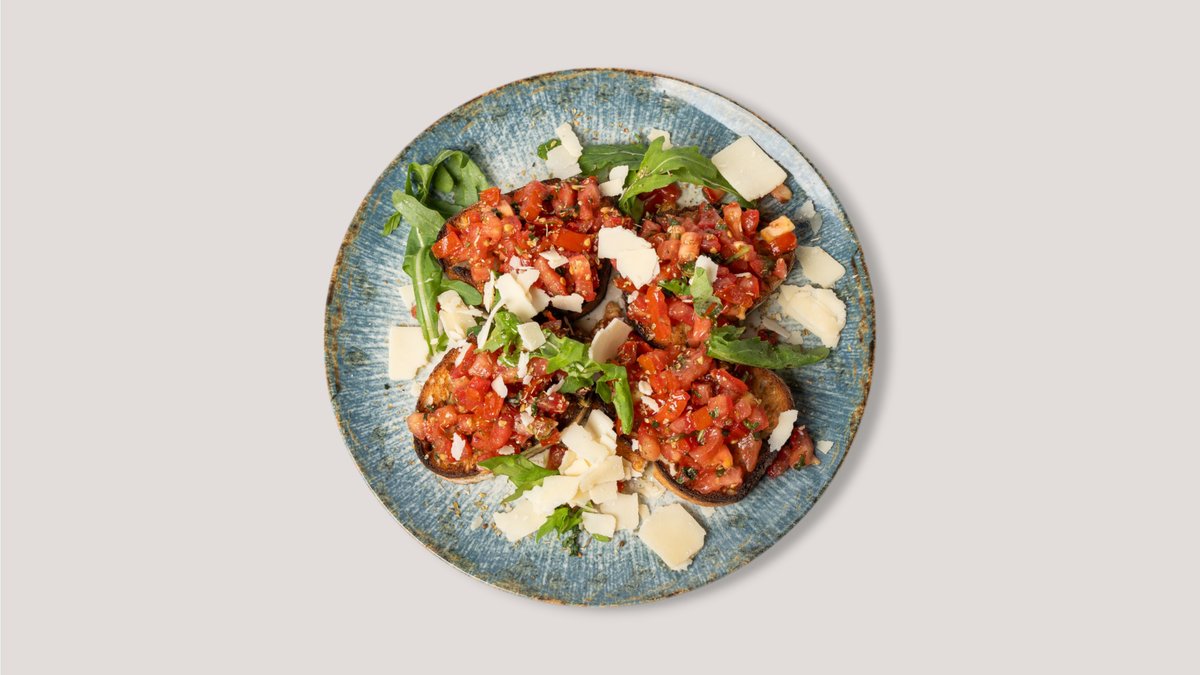 4 frisch geröstete Ciabatta-Scheiben mit marinierten Tomatenwürfeln, Rucola und italienischem Hartkäse