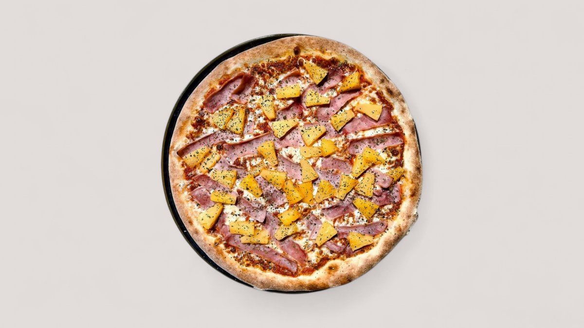 mit Schinken vom Schwein, Ananas, Tomatensauce und Mozzarella