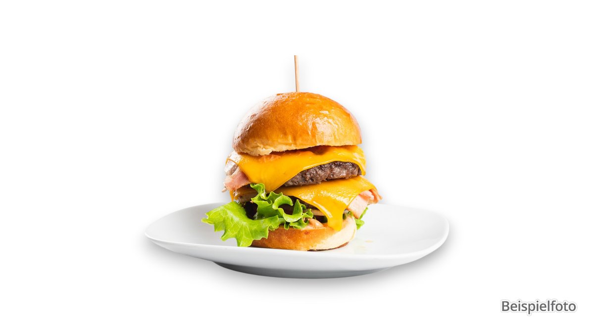 mit doppelter Portion Rind (2 x 150 g), extra Cheddar, Tomaten und GewĂĽrzgurken