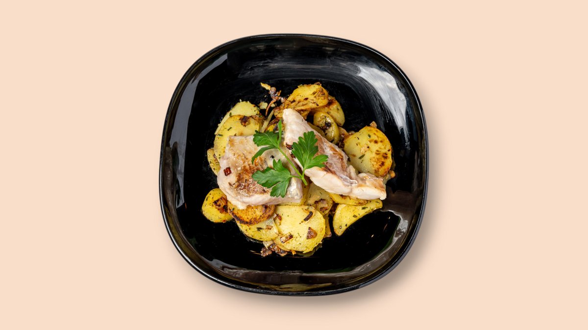 Duett aus frischem Fischfilet in Senfsoße mit Bratkartoffeln