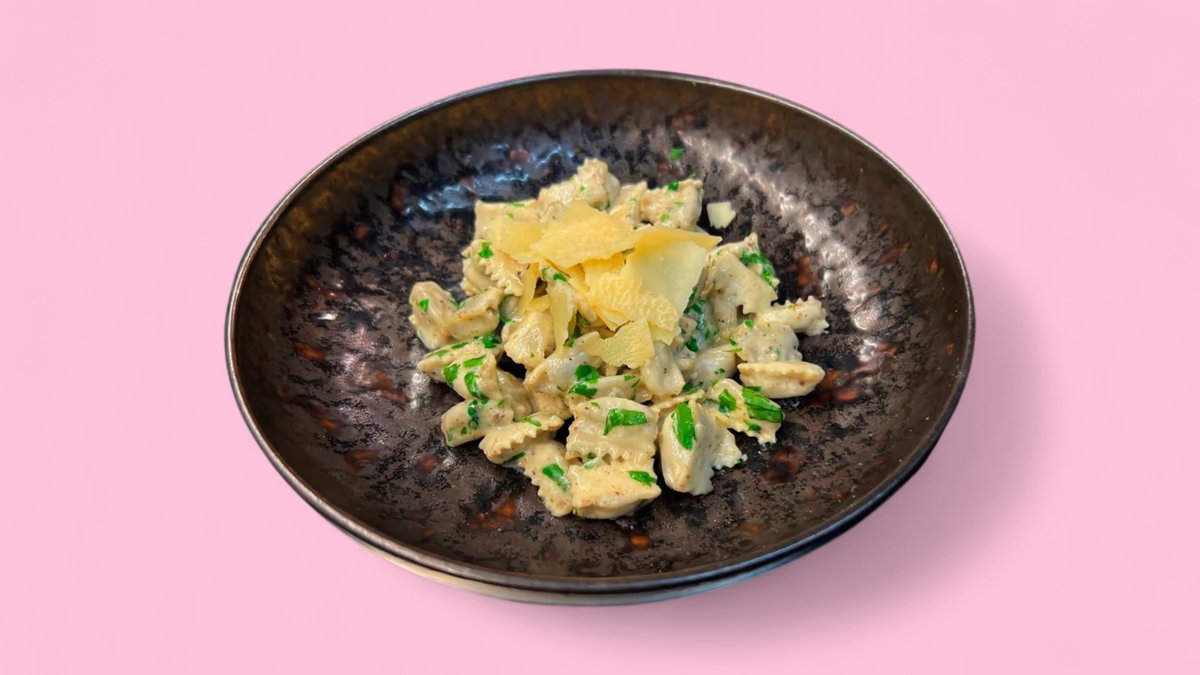 mit Agnolotti aus Piemont, Rind-Schwein-Mix in cremiger Parmesansoße und Trüffelpaste
