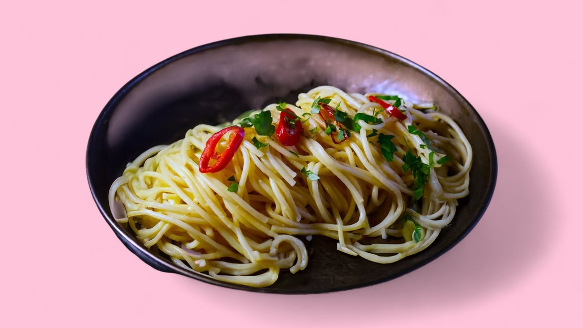 leicht, würzig und italienisch mit feinen Spaghetti, aromatischem Knoblauch, einem Hauch Chili und bestem Olivenöl