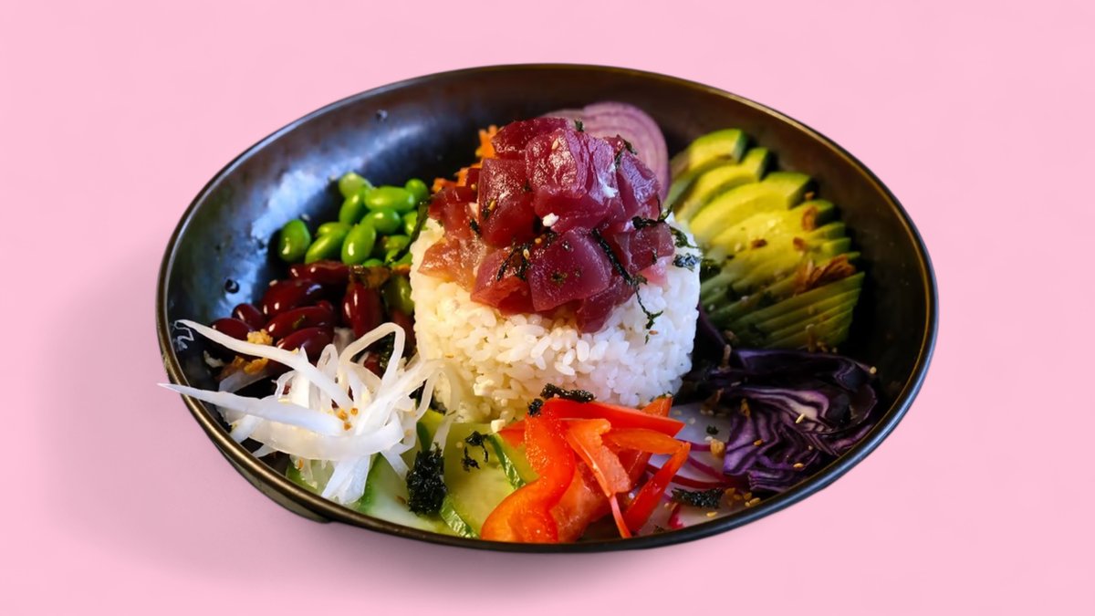 alle Bowls werden mit Reis, Rettich, Avocado, Bohnen, Rotkohl, Karotten, Gurken, Ingwer, Nori, Sesam, Röstzwiebeln, würzige Mayonnaise („Buddha Bowl“ wird ohne Mayonnaise zubereitet) und eine Soße deiner Wahl zubereitet