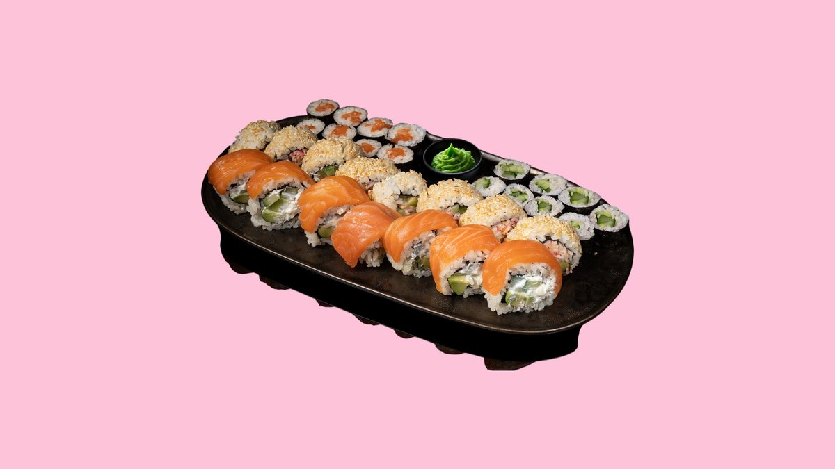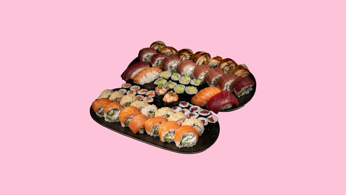 62 Stück, groß und premium Avocado Maki Lachs Maki Thunfisch Maki Lachs Nigiri Thunfisch Nigiri Philadelphia Roll Golden Dragon Kanikama Sesame Roll und Gunkan mit Lachs- und Thunfisch-Tatar