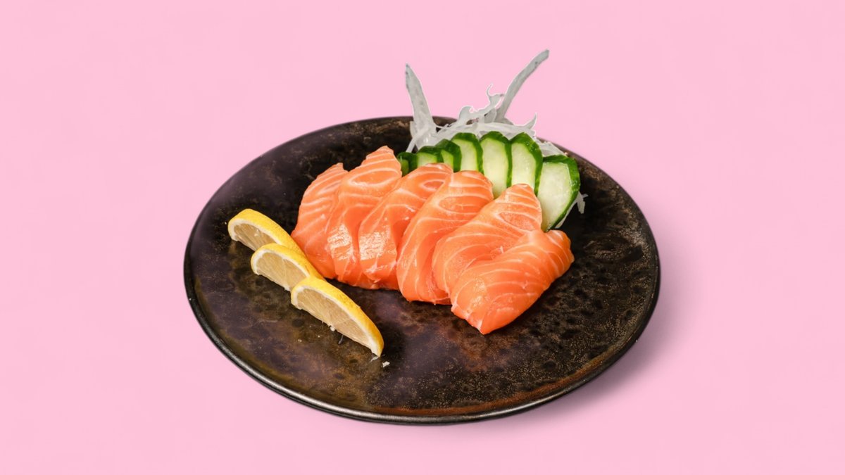 6 Stück, frisch geschnitten Lachs-Sashimi-Stücke von hochwertiger Qualität