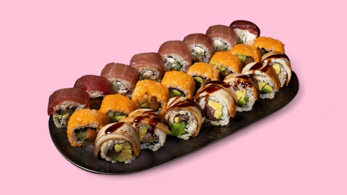 süß-herzhaft, premium mit Reis, Nori, Tamago, Avocado, Tobiko, Thunfisch und Aal in Unagi-Soße