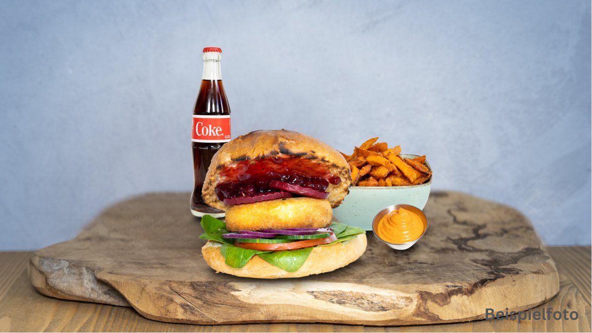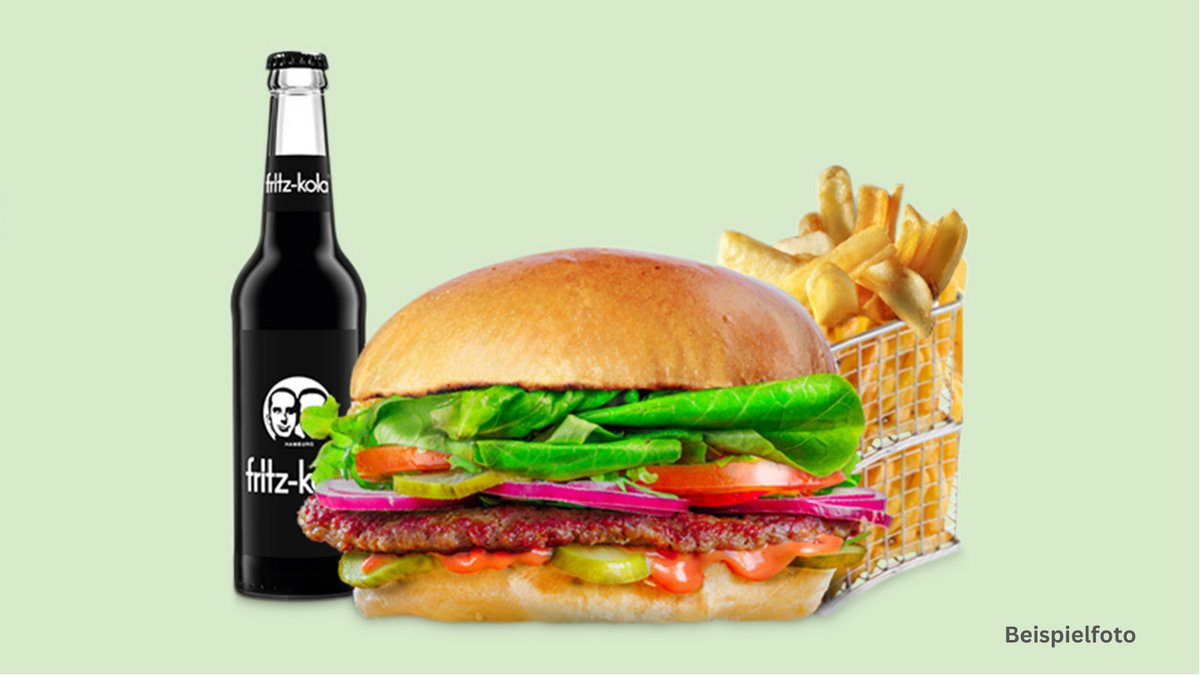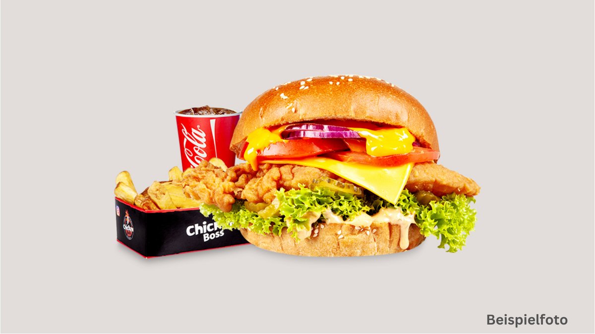 alle Menüs werden mit einem Burger, einer Beilage, einer Soße und einem Getränk deiner Wahl serviert