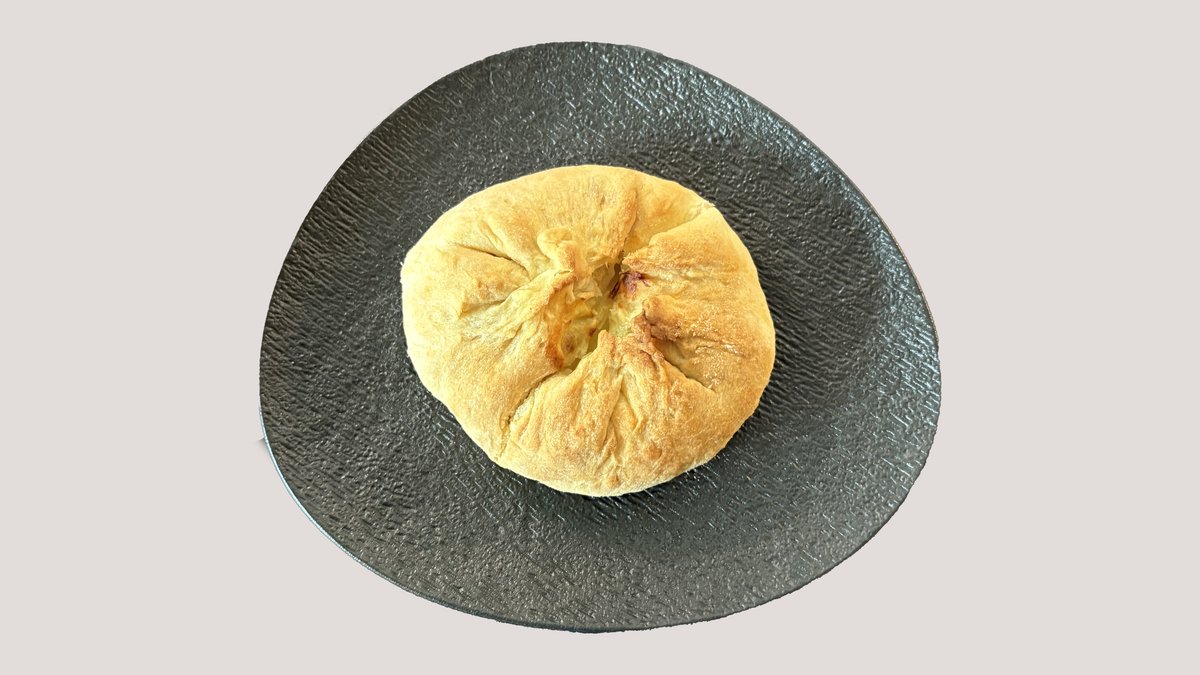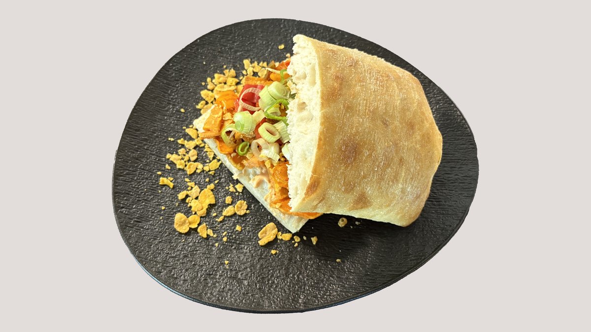 Focaccina mit hauseigener, würziger roter Aioli, Süßkartoffel-Crunch, gebackener Paprika und Lauchzwiebeln