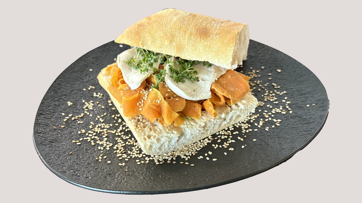 Focaccina mit hauseigener Cashewcreme & roter Aioli, Sesammöhren, Vanozza-rella, Gartenkresse