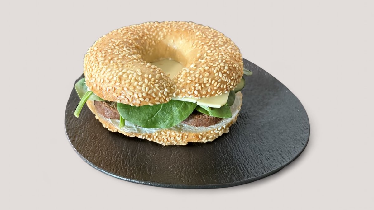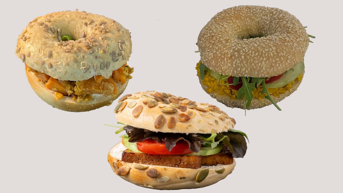 mit Tofu-Scramble, Vrischkäse, Veta, Tomaten, Gurken und Rucola (Bagelauswahl inkl. Körner zufällig)