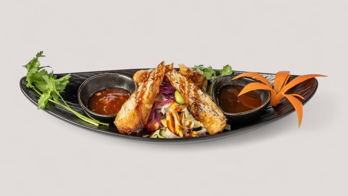 füt 2 Personen mit Tempura-Garnelen, Papaya-Salat, Sommerrollen und Wantan