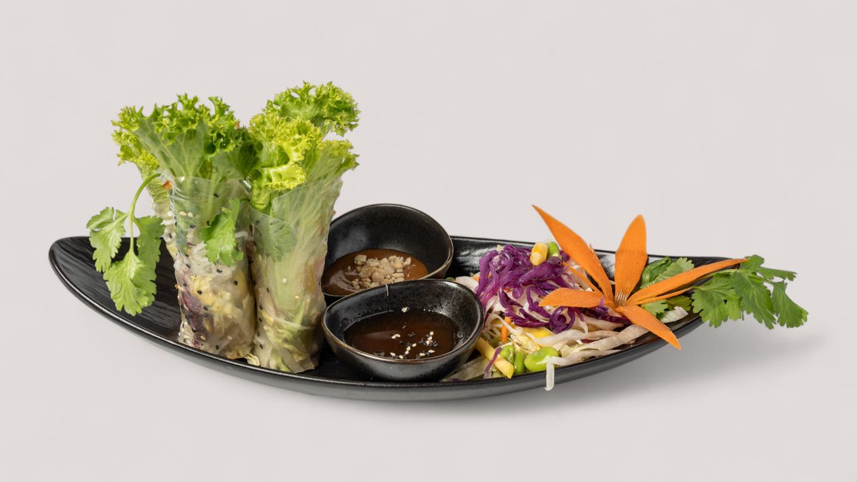 2 Stück Sommerrollen mit Reispapier, Reisnudeln, Ei, Salat, Gurken, Karotten, Koriander, Mango und einer Zutat deiner Wahl