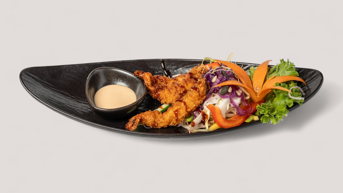 3 Stück schwarze Tigergarnelen mit knusprigen Klebreisflocken und hausgemachtem Dip