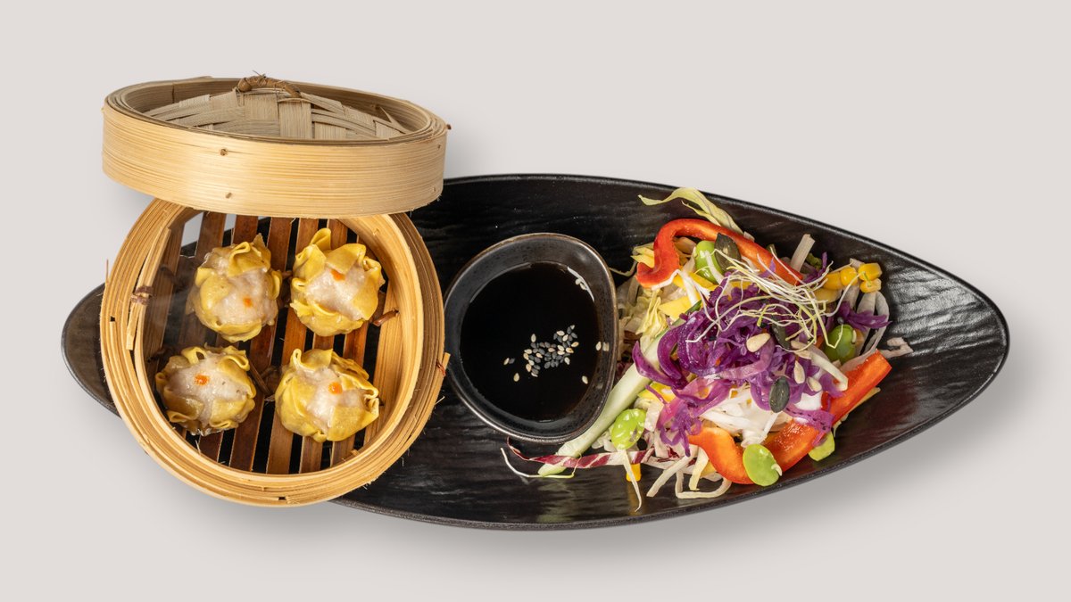 3 Stück gedämpfte Teigtaschen, mit verschiedenen Füllungen, Kürbis, Süß-Sauer-Soße und einer Zutat deiner Wahl