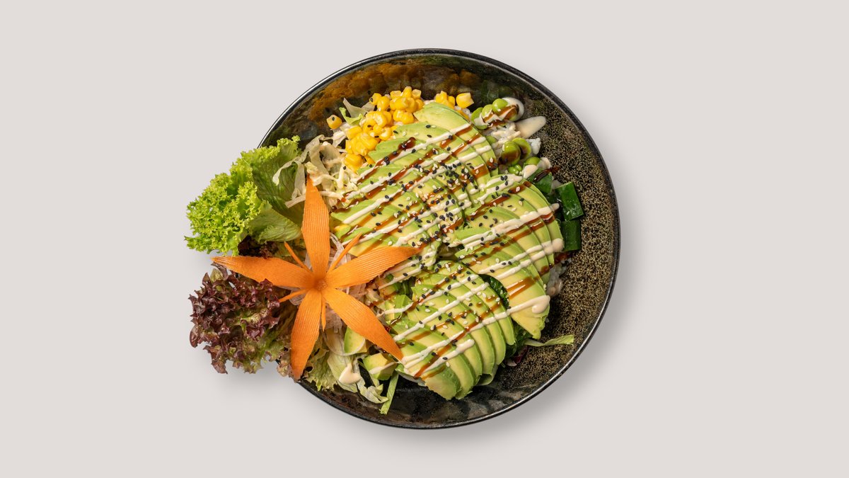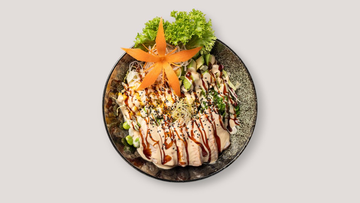 große Sushi Bowl mit Gurken, Avocado, Oshinko, japanischem Omelett und Cocktail-Unagisoße