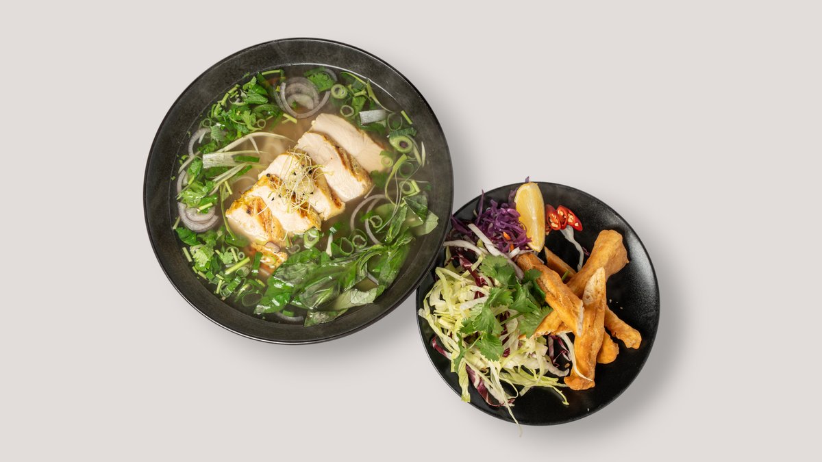 Reisbandnudelsuppe mit traditioneller 12-Kräuter-Brühe, Reisbandnudeln, Kräutern, Lauchzwiebeln und einer Zutat deiner Wahl