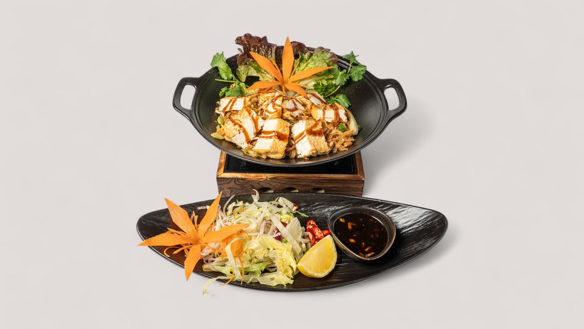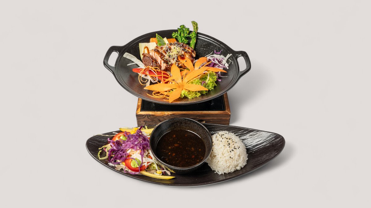 mit Jasminreis, Sesam, Gemüse, Salat und einer hausgemachten Soße deiner Wahl