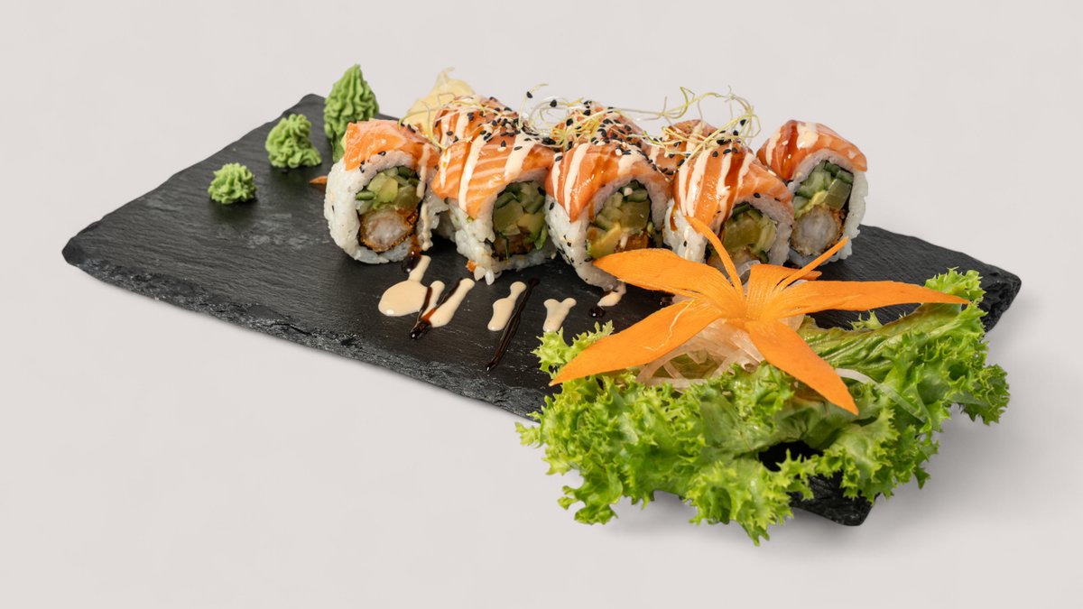 mit Lachshaut, Gurken, Mango, Philadelphia, bedeckt mit Ebi und Tobiko