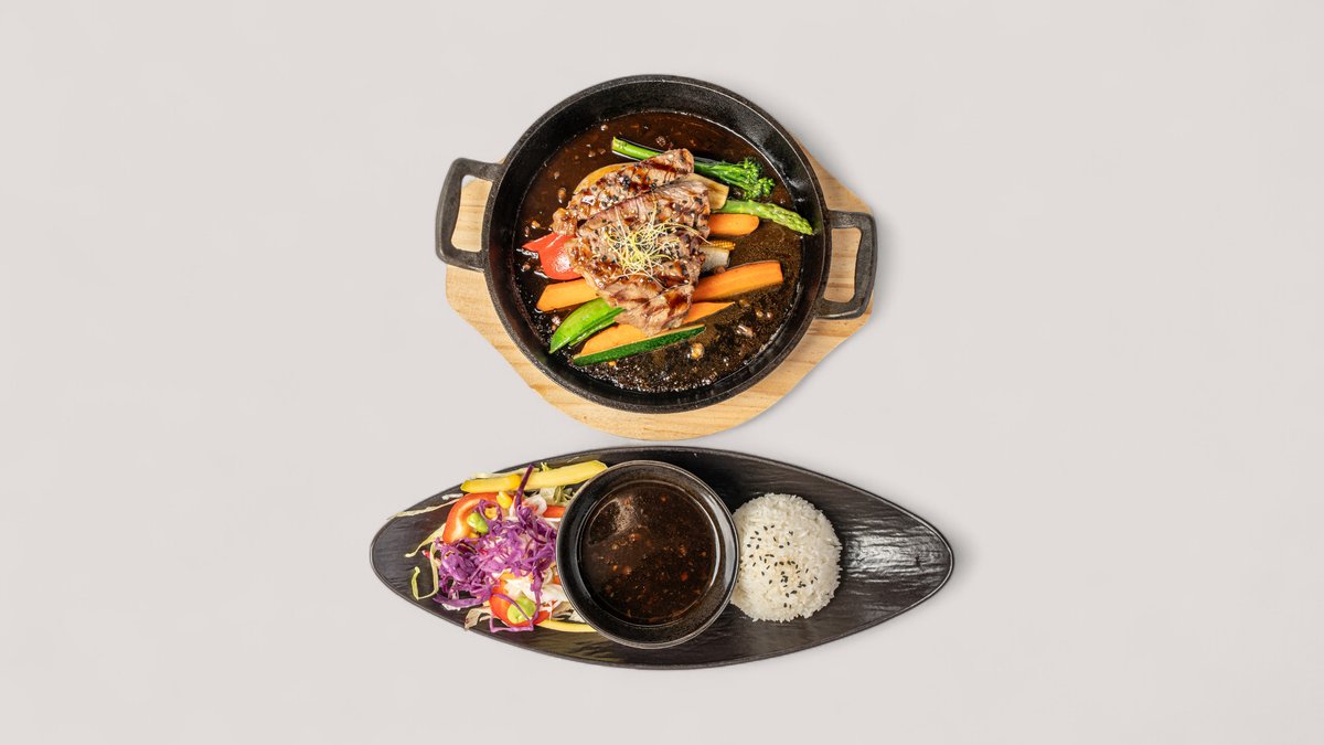 mit saisonalem Gemüse, hausgemachter dunkler Soße, Reis und einer Zutat deiner Wahl