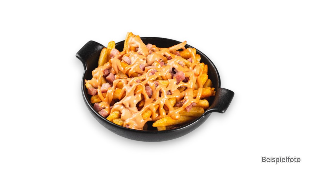 doppelt frittierte Pommes frites mit Parmesan, Speck vom Schwein, Käsesoße und Schnittlauch