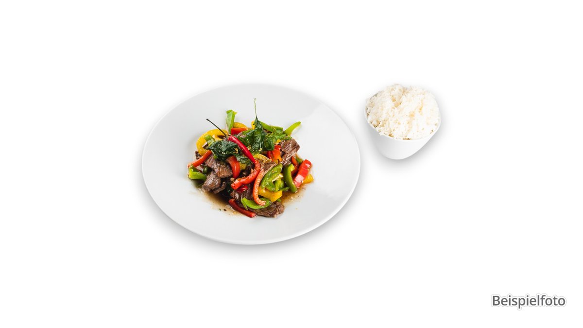 Kalbfleisch mit Tomaten, Paprika, Zwiebeln und Reis als Beilage