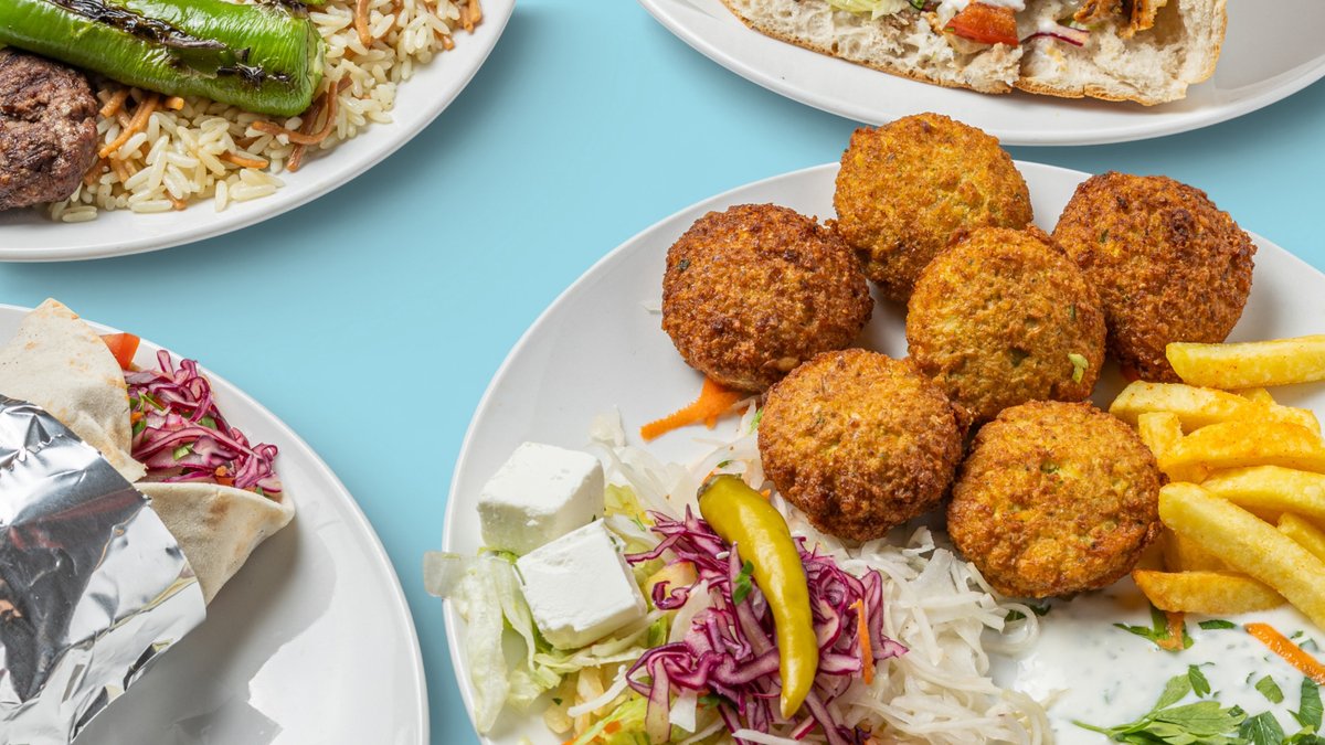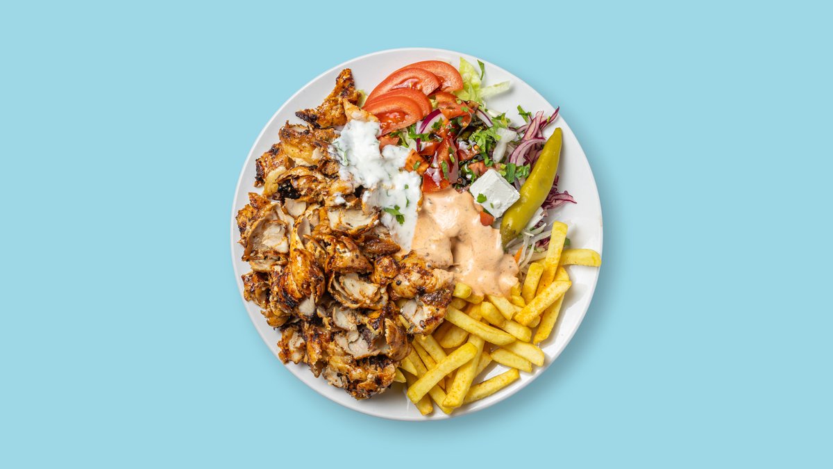 Drehspießfleisch mit Pommes frites oder Reis, Salat und einer Soße deiner Wahl