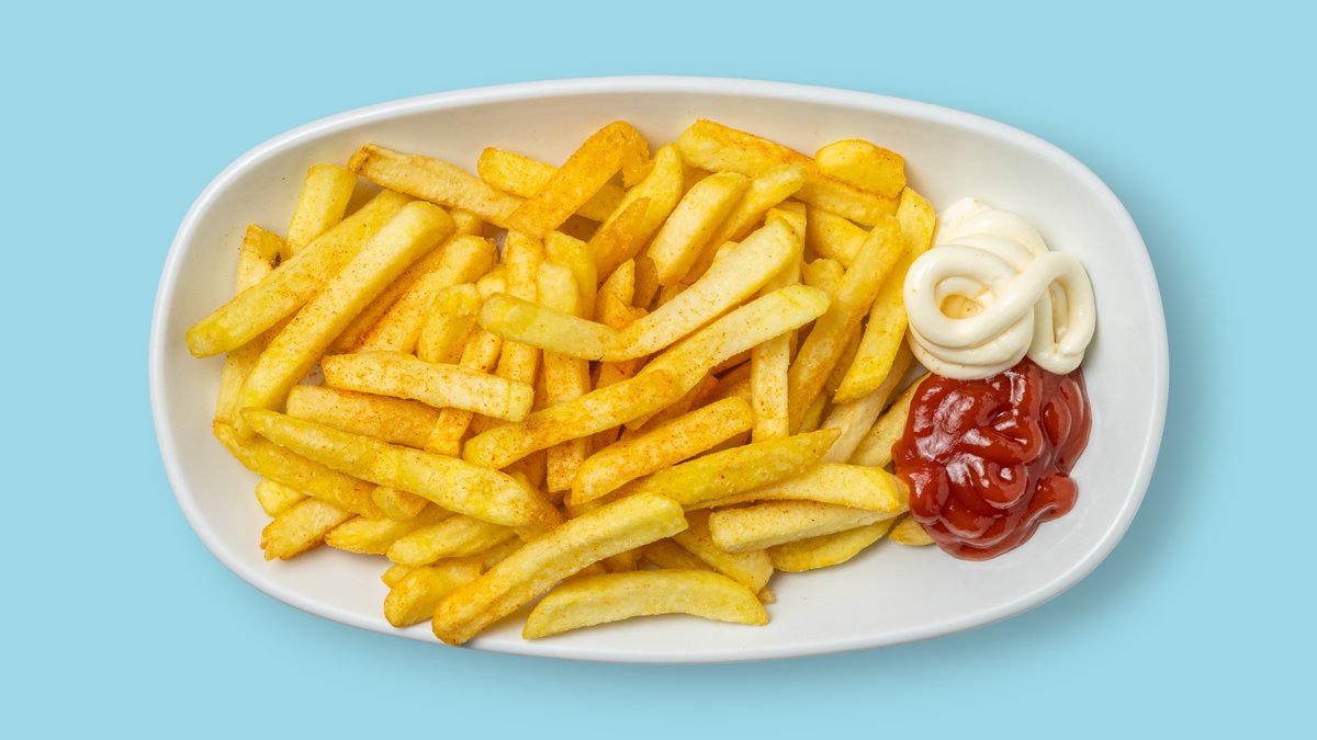 paniert und frittiert, mit Pommes frites und einer Soße deiner Wahl