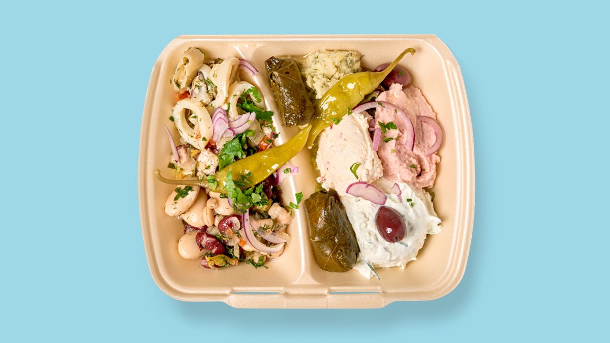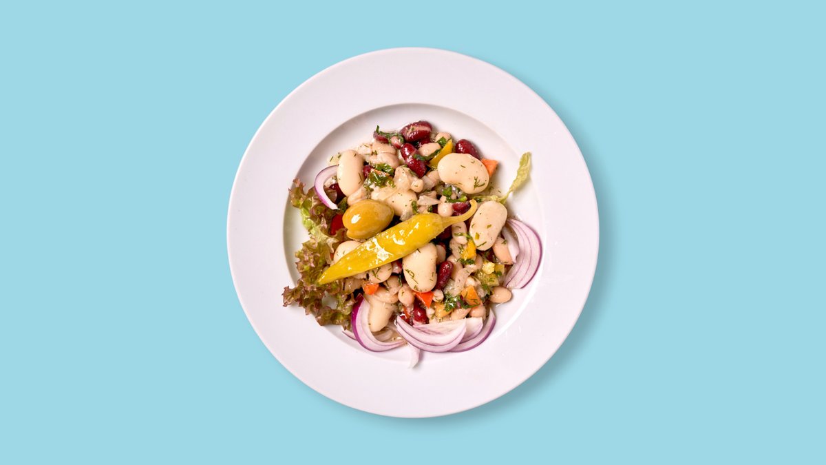 mit Weiß und Rotkraut, grünem Salat, Gurken, Tomaten, Zwiebeln, Paprika, Oliven, Peperoni, Schafskäse, Bohnensalat und Olivenöl