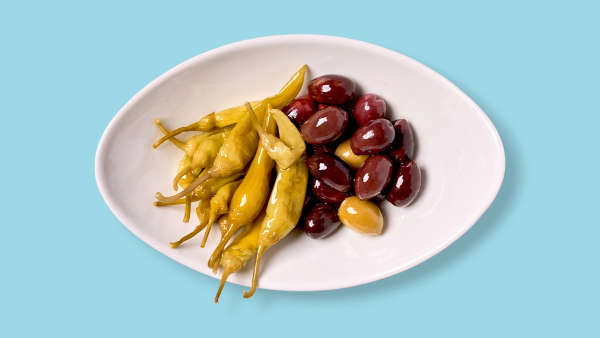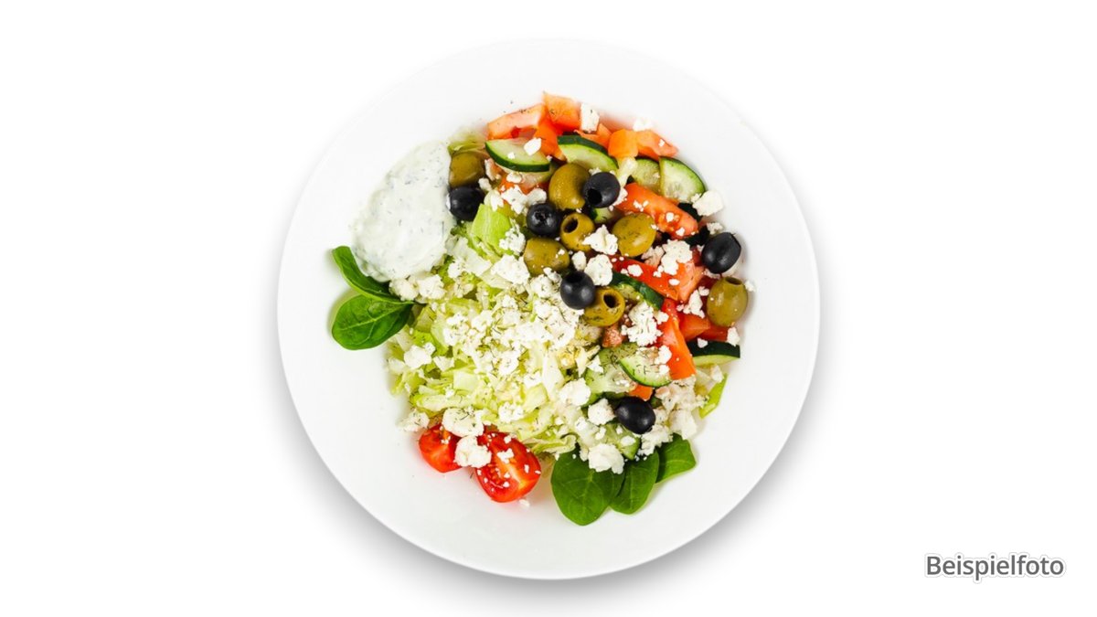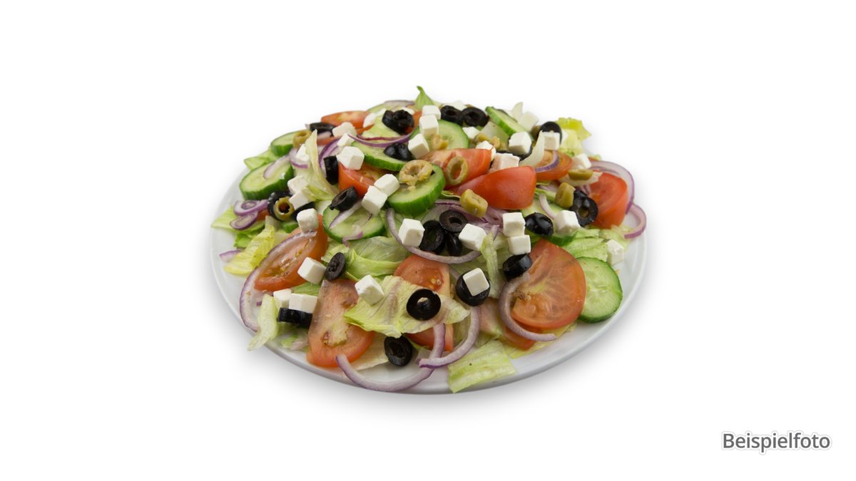 mit grünem Salat, Gurken, Tomaten, Zwiebeln, Oliven, Paprika, Peperoni, Schafskäse und Olivenöl