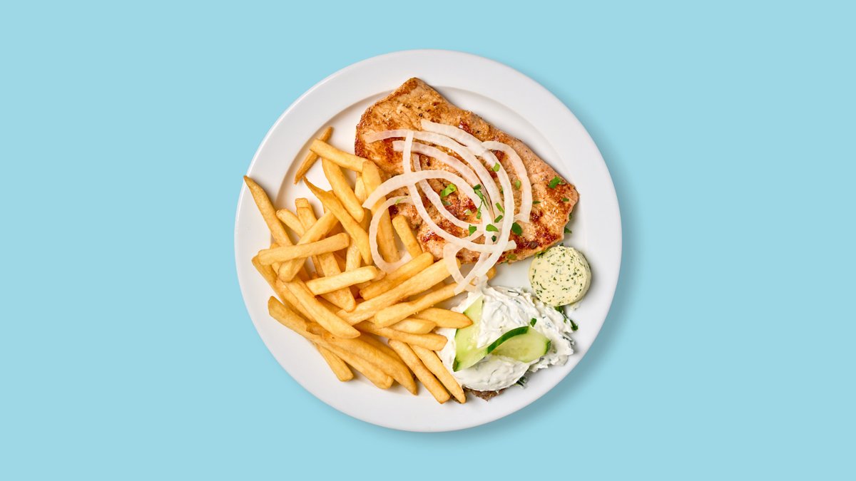 alle Gerichte werden mit gemischtem Salat und Pommes frites serviert